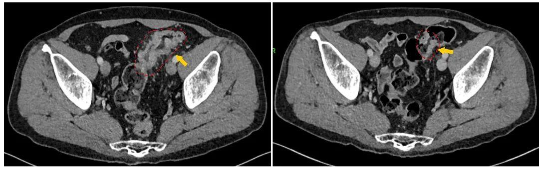 经1程化疗后,结肠肿瘤及周围转移淋巴结明显缩小,肝脏转移灶也明显缩小!