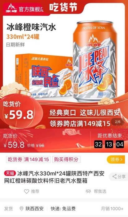 诞生于1953年的冰峰饮料,是西安的老牌汽水,与凉皮、肉夹馍一起被称为“三秦套餐”。主营产品为“冰峰”牌的橙味饮料、酸梅汤以及纯净水,一年销量3亿多瓶。